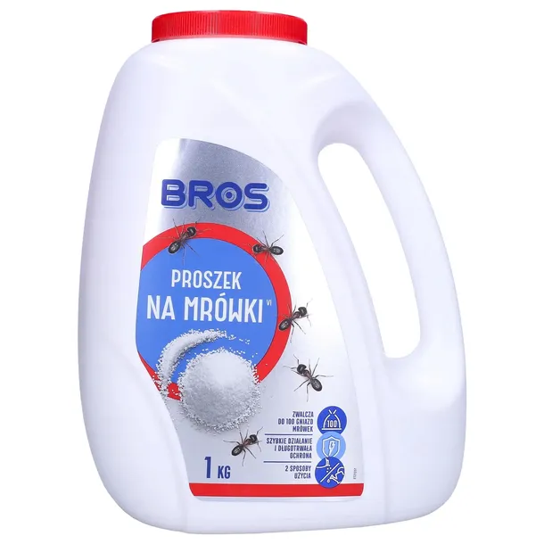 Preparat owadobójczy BROS PROSZEK NA MRÓWKI zwalczający mrówki, w formie gotowej do użycia przynęty do posypywania lub polewania.